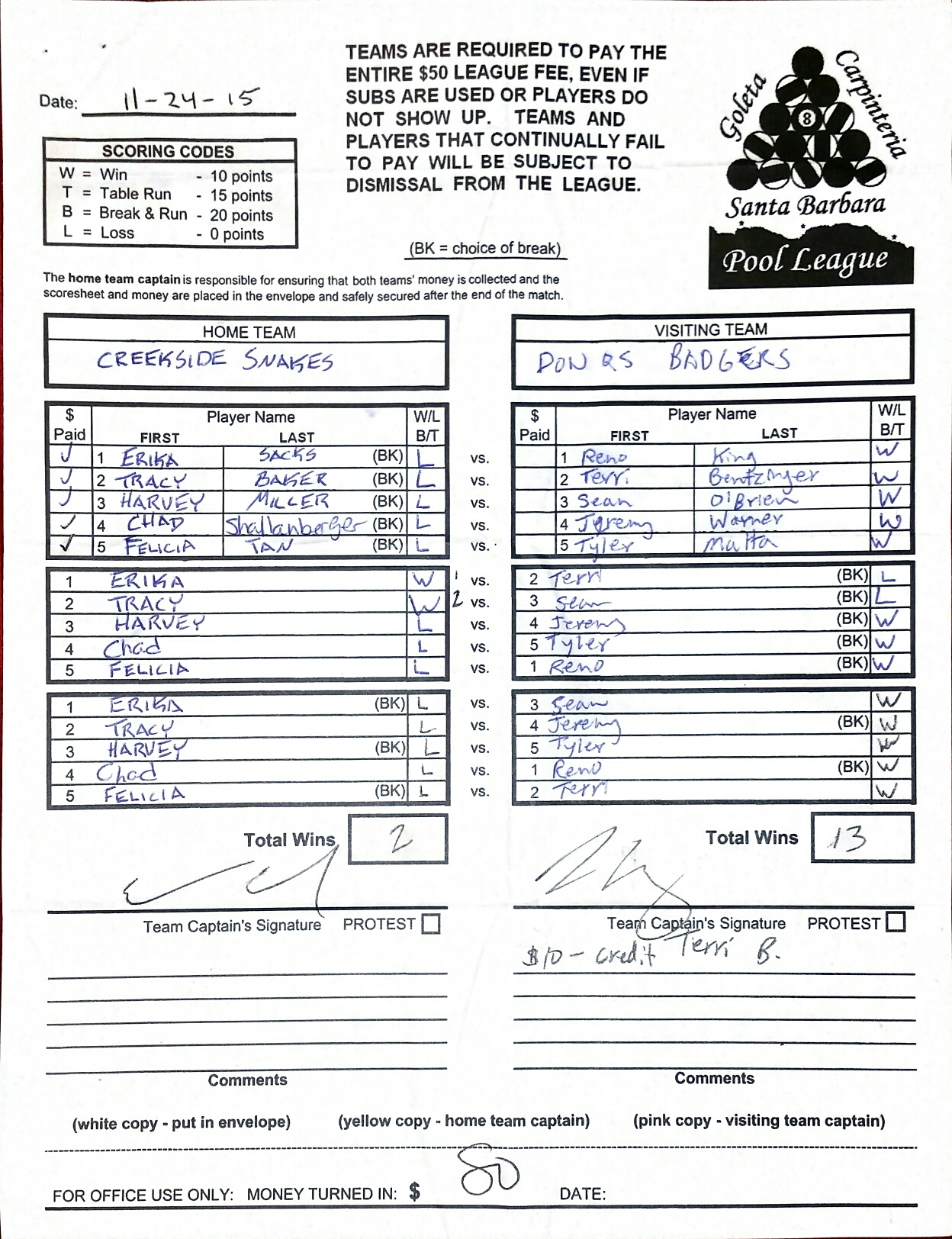 L | Tracy Baker | vs | Terri Bentzinger | W |