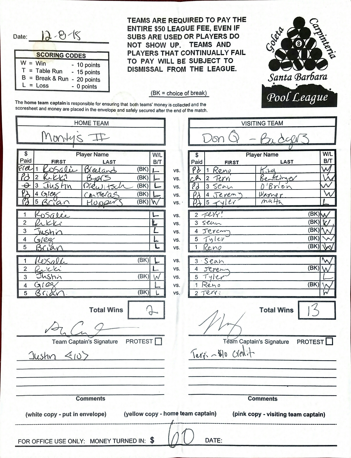 L | Rosalie Breeland | vs | Terri Bentzinger | W |