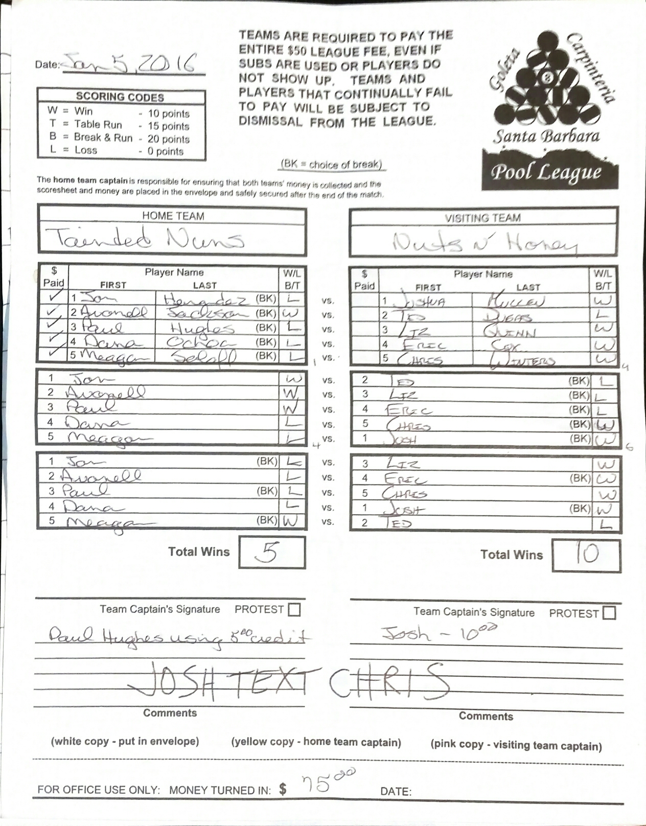 L | Dana Ochoa | vs | Chris Winters | W |
