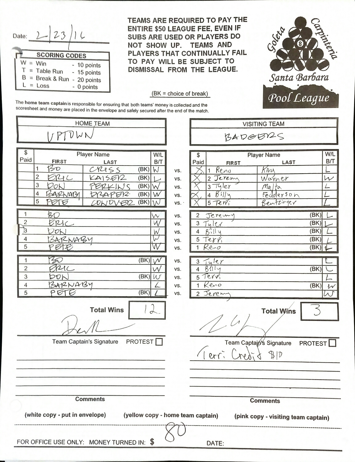 W | Barnaby Draper | vs | Terri Bentzinger | L |