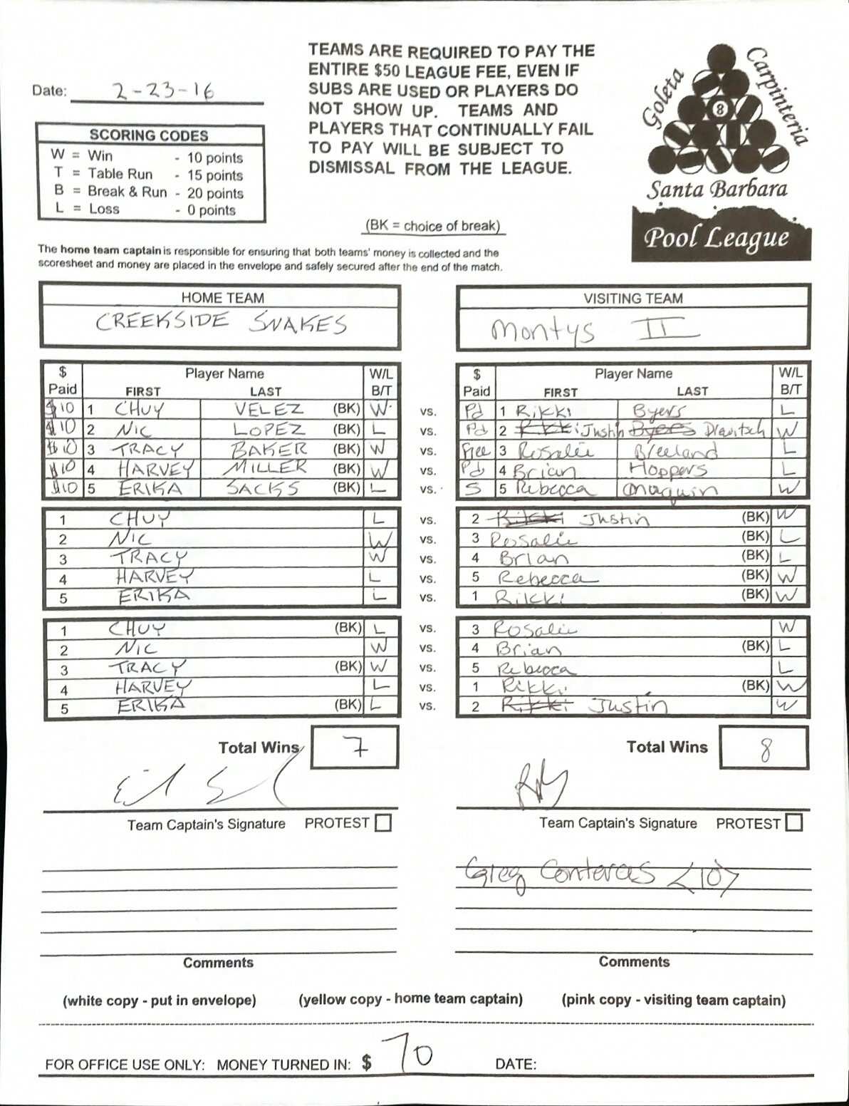 W | Tracy Baker | vs | Rosalie Breeland | L |